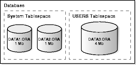 Tablo uzaylarının toplam kapasitesi, sahip oldukları veri dosyalarının toplam kapasitesine eşittir. (Yukarıdaki şekil için SYSTEM tablo uzayı 2MB, USERS tablo uzayı 4MB).