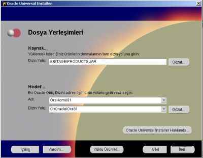 8 - Ürün bilgileri listesinin yüklenmekte olduğunu belirten bir pencere geldikten sonra karşınıza "Yüklenebilecek Ürünler" penceresi gelir. Yukarıda da anlattığımız gibi burada üç ürün vardır. Oracle8i Enterprise Edition seçeneğini işaretleyerek "İleri" butonuna basın. 9 - "Yükleme Türleri" penceresinde tipik, minimum ya da özel seçeneklerinden biri seçilerek "İleri" butonuna basılır. 10 - Eğer tipik yükleme, ya da özel yükleme seçildiyse burada Oracle yardım dosyalarını diskten ya da CD-Rom'dan çalıştırma seçeneklerinden birini seçmeniz beklenir. Eğer diskte yaklaşık 133MB boş yeriniz varsa diske yükleme seçeneğini seçebilirsiniz. 11 - Bilgisayarınızda daha önceden yüklü bir Oracle veritabanı varsa bu kısımda bunu güncellemek isteyip istemediğinizi soran bir pencere gelir. "Migrate an Existing Database" kutusunu işaretlerseniz yüklemeden hemen sonra "Oracle Data Migration Assistant" programı çalışır ve eski veritabanınızı yeni sürüme terfi ettirir. 12 - "İleri" butonunu tıkladığınızda karşınıza "Database Identification" penceresi gelir. Burada "Global Database Name" ve "SID" alanlarını doldurmanız istenir. Buraya vereceğiniz isim veritabanının adı olacaktır. Bu alanlardan birini doldurduğunuzda diğeri de aynı değeri otomatik olarak alır.